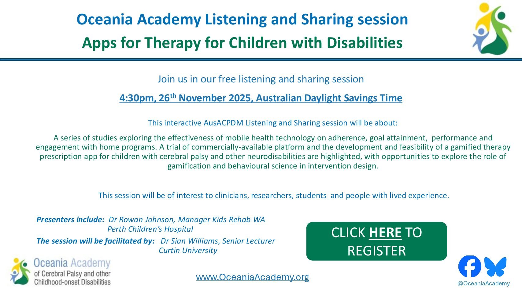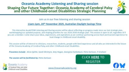“Shaping Our Future Together: Oceania Academy of Cerebral Palsy and other Childhood-onset Disabilities Strategic Planning Join us in our free listening and sharing session. 20th November 2025, 11:00am – 1:00pm...